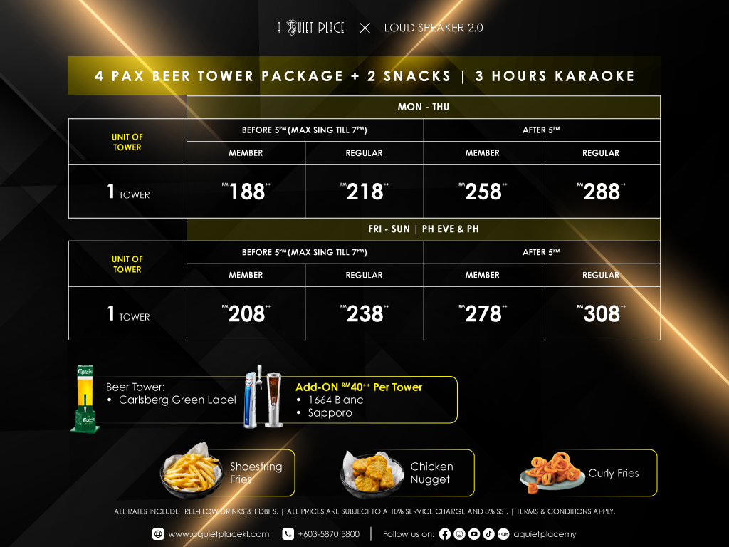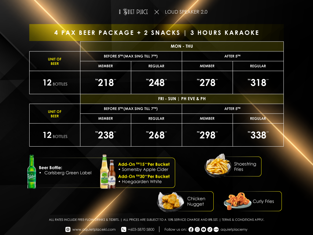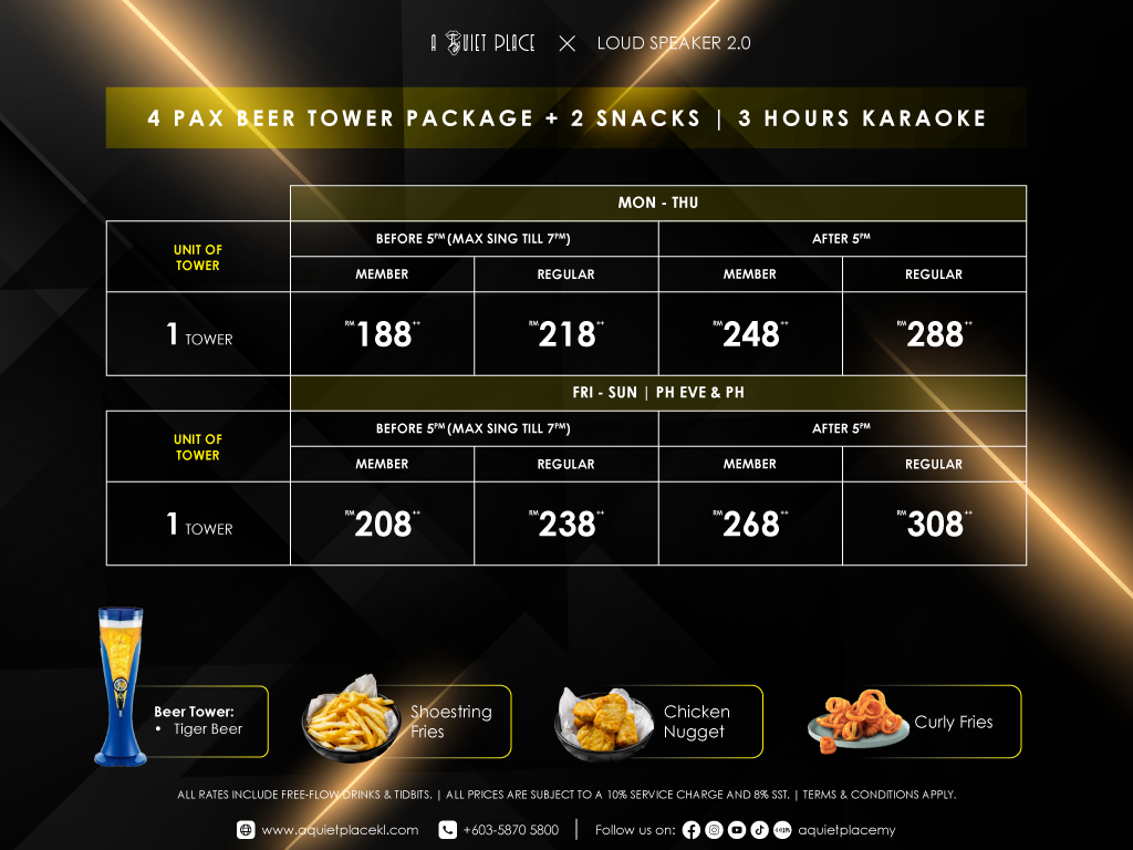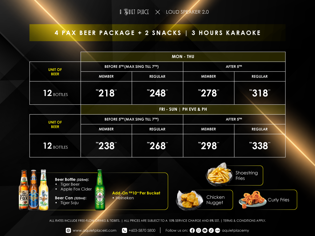 No More Room Charge! With Loud Speaker’s Long-Term Head Charge promos starting from as low as RM10++, you can enjoy up to 3 hours of karaoke with free-flow non-alcoholic drinks and tidbits.
